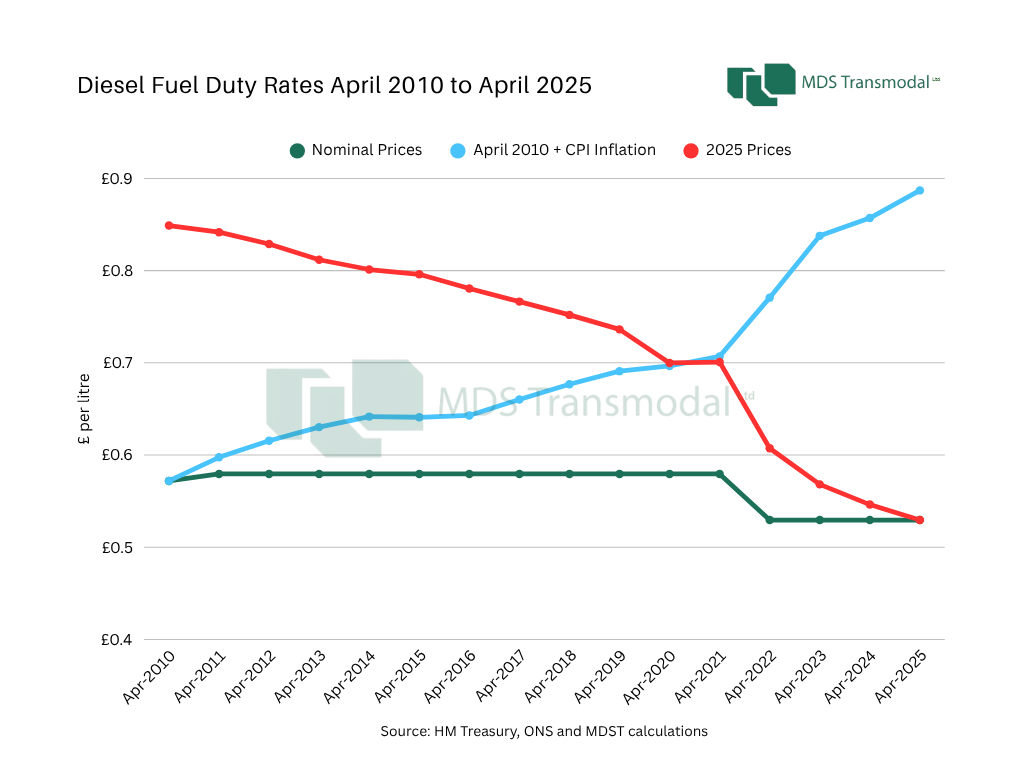 Unlike VAT and other taxes (e.g. income tax) which are calculated on a percentage basis, excise duties such as that levied on road fuel are valued at a fixed cost per unit sold, in this case pence per litre of fuel. In economic terms, therefore, freezing duty rates has the effect of eroding its overall ‘purchasing power’ value over time due to inflation.