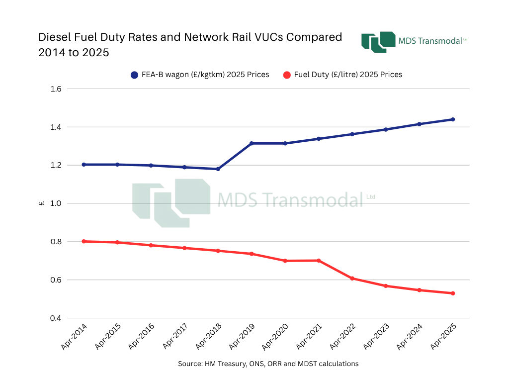 By way of a comparison, Network Rail’s regulated track access charges paid by the rail freight operators (so called variable user charges or VUCs) have increased in value over the past six years. These charges are effectively a proxy for fuel duty in that the amount paid is proportional to distance travelled (fuel consumption also being distance related). This is illustrated in the graph below. The red line is taken from the previous graph, showing diesel fuel duty rates since 2014 re-based into 2025 prices and illustrating its declining value in real terms. In contrast, the blue line shows the VUCs for a FEA-B intermodal platform wagon since 2014 (in £ per thousand gross tonne-km). Having been broadly flat during Control Period 5 (CP5, April 2014 to March 2019), they have since been increasing in value during CP6 (April 2019 to March 2024) and into CP7 (since April 2024).